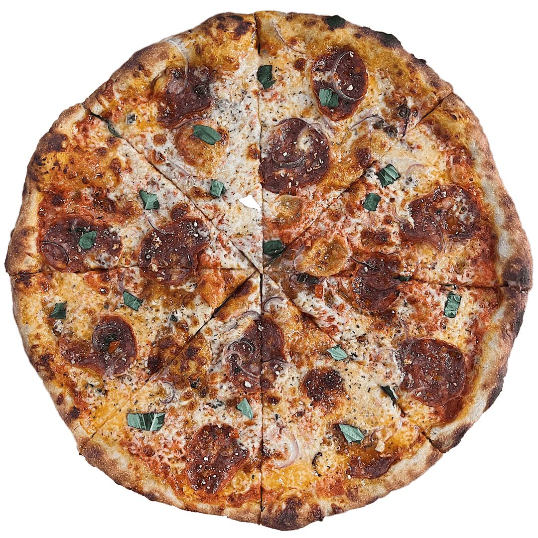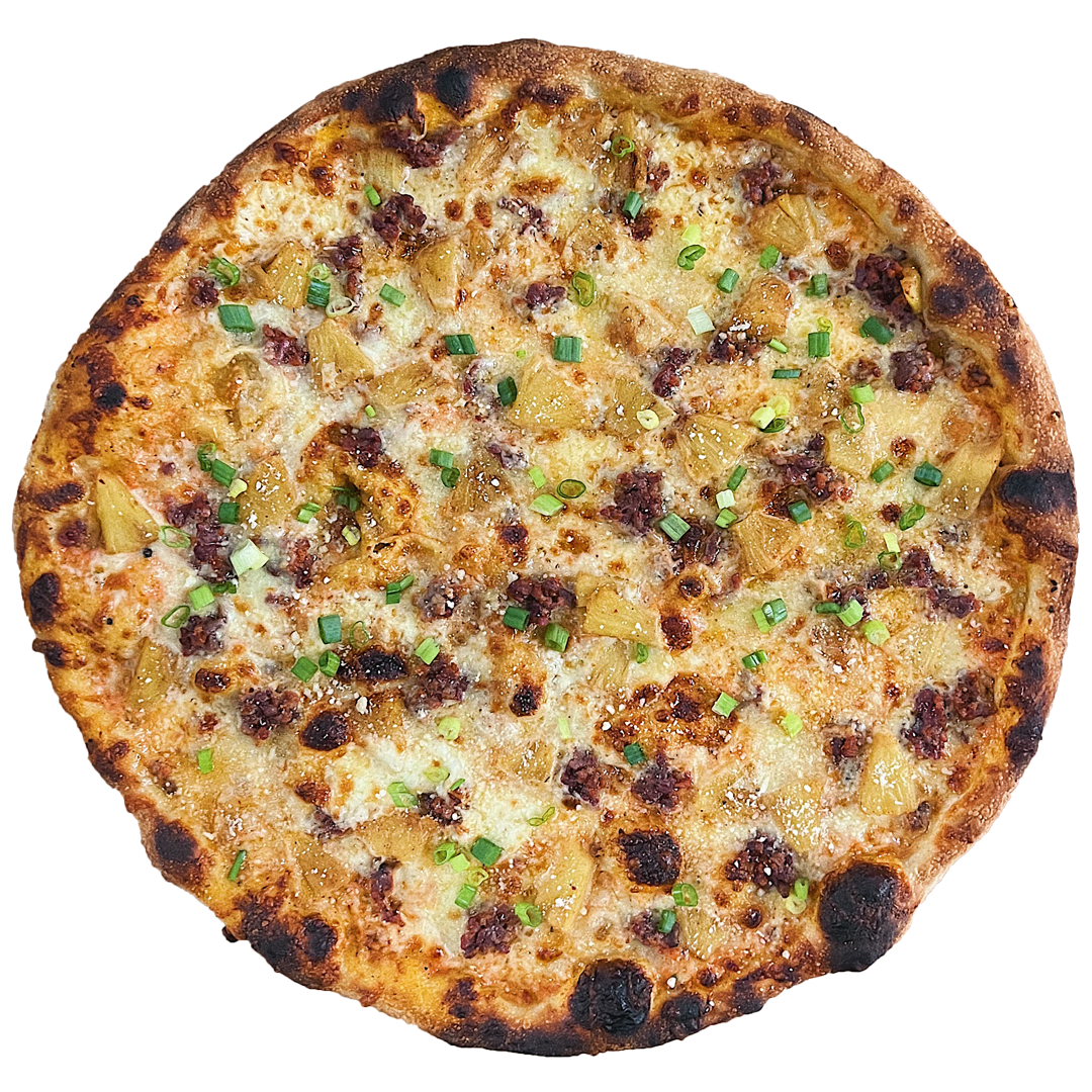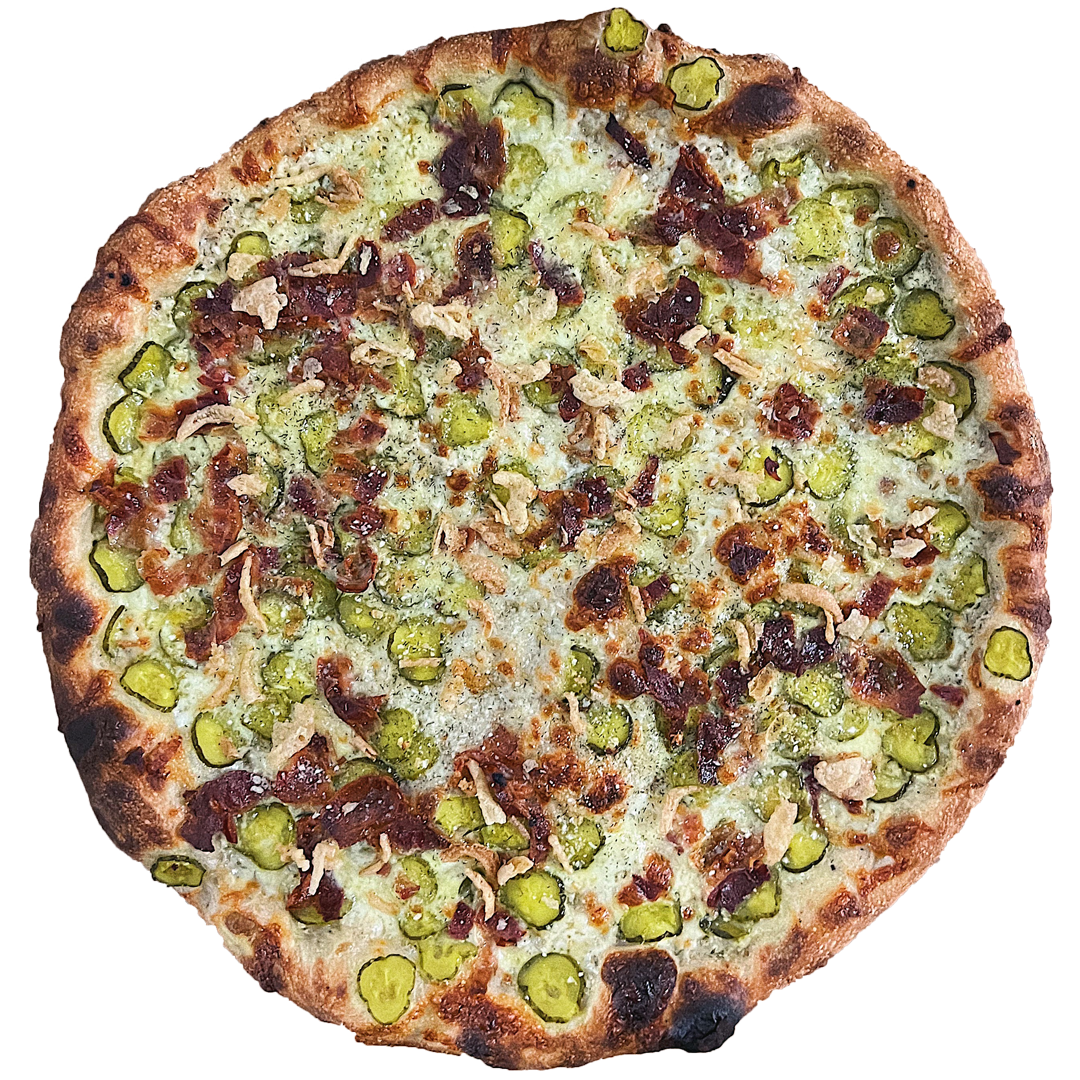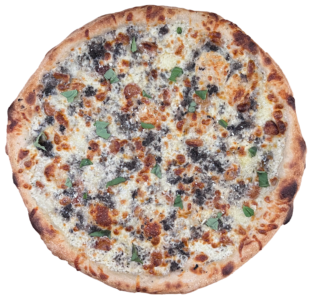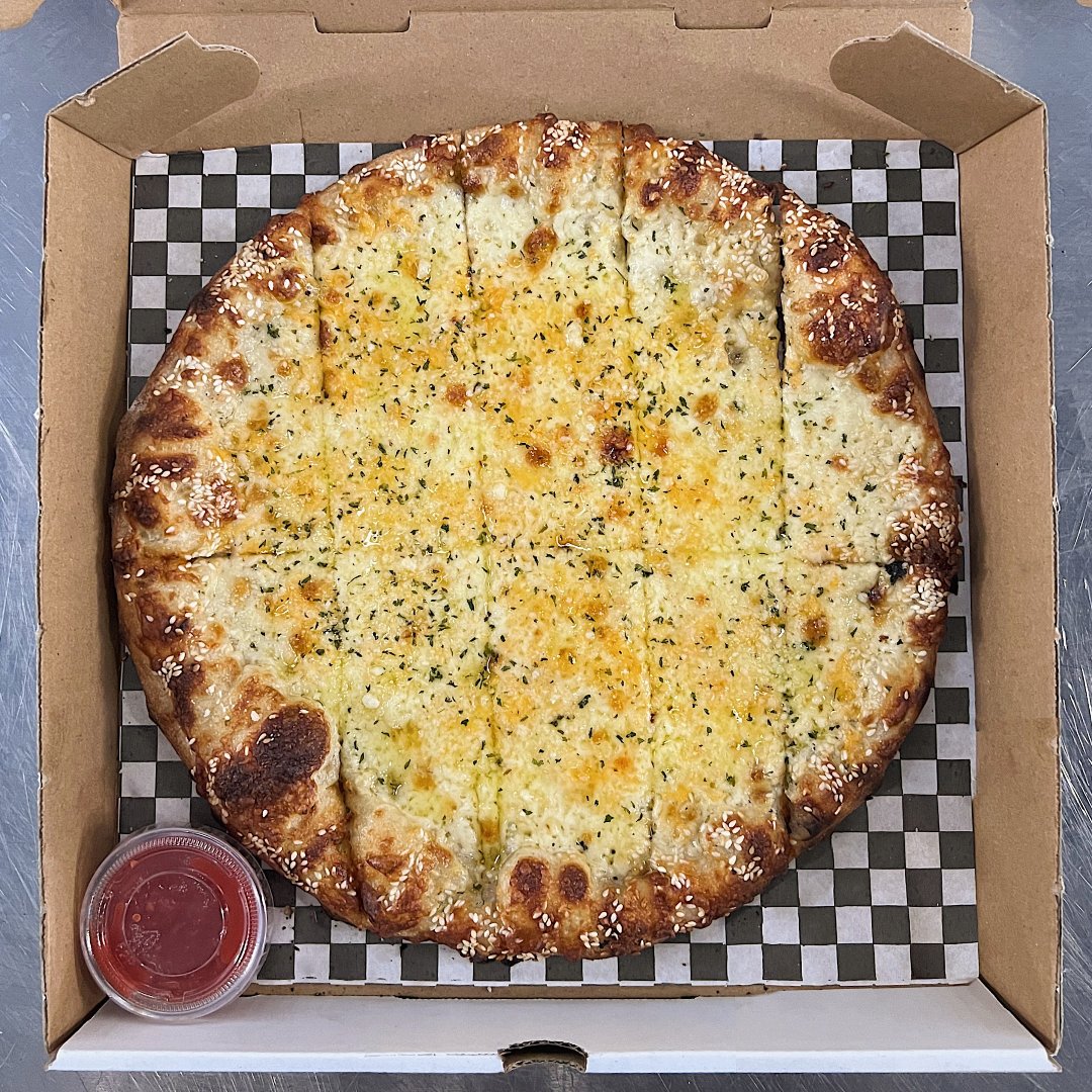 12”, sesame seed crust, garlic confit parm base, mozz & cheddar cheese, fresh crushed garlic, sadboy sprinkles. finished with parm, parsley, and white truffle oil.